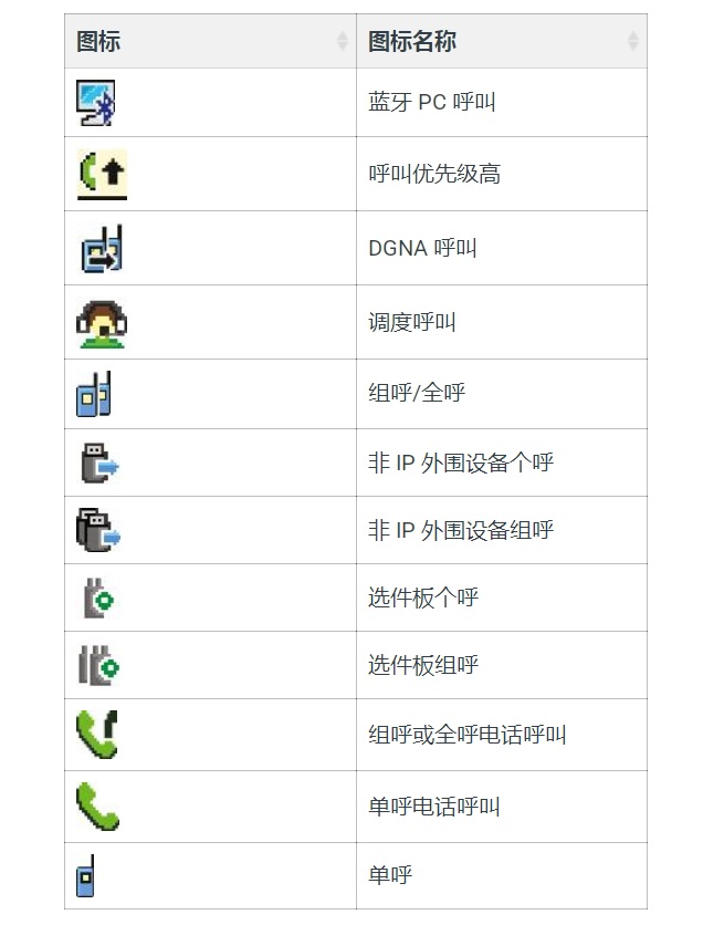 以下图标在呼叫过程中出现在显示屏上。这些图标也出现在通讯录中,表示别名或 ID 类型。