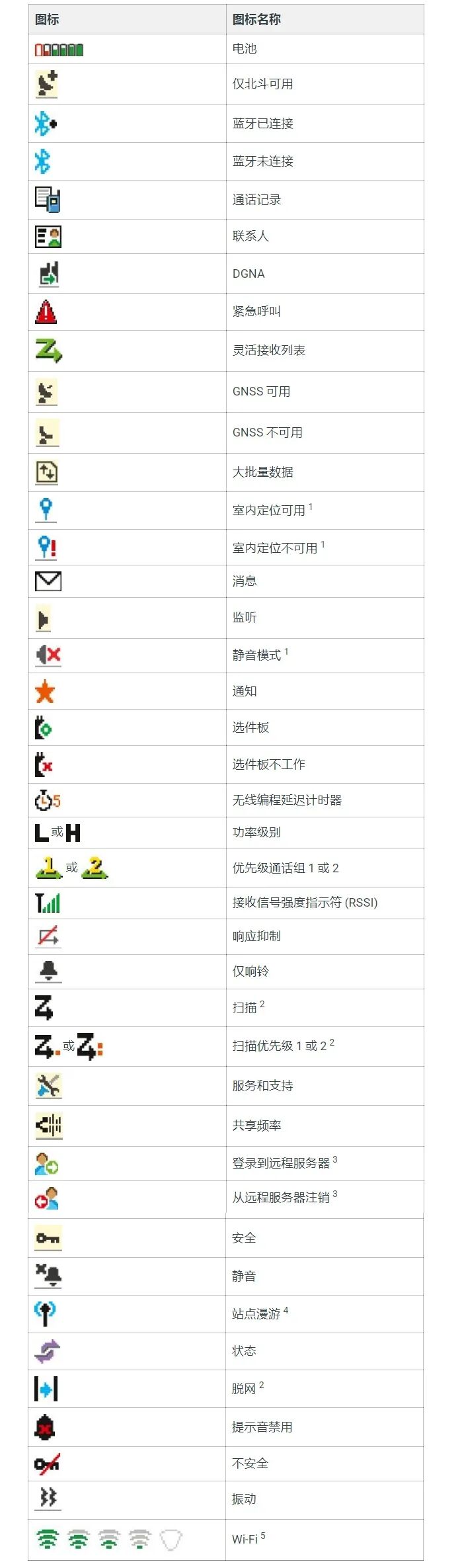 显示屏图标出现在对讲机显示屏顶部的状态栏中。图标按出现或使用顺序排列在最左侧,并且是信道特定图标。