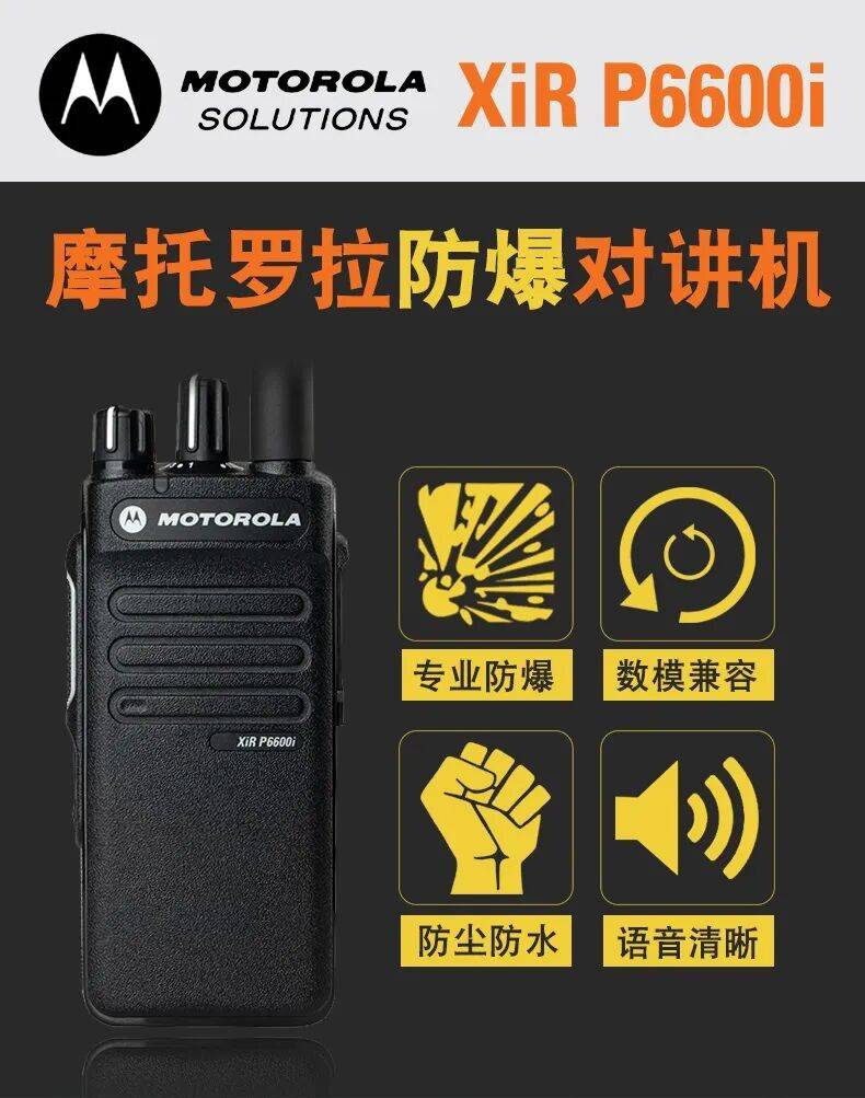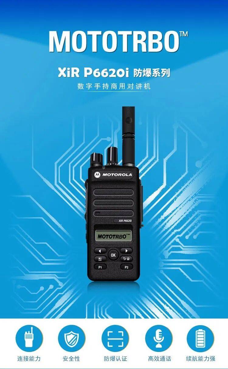 摩托罗拉XiR P6620i防爆对讲机是一款符合防爆标准的数字集群通信设备,专为危险环境设计,支持数字和模拟双模通信,确保在复杂场景下的可靠连接。P6620i防爆对讲机频率范围覆盖VHF波段(136-174MHz)和UHF波段(403-527MHz),提供256个信道,信道间隔支持12.5KHz和25KHz,工作电压为7.5V,典型电池容量为2900mAh,理论续航时间可达28小时;其防护等级达到IP67,具备防水、防尘和防爆特性,适用于Class I, II, III危险环境;主要功能包括消噪技术、远程管理(如远程禁用和状态检查)、空中编程以及多种编码解码支持(如MDC、Quik-Call II)