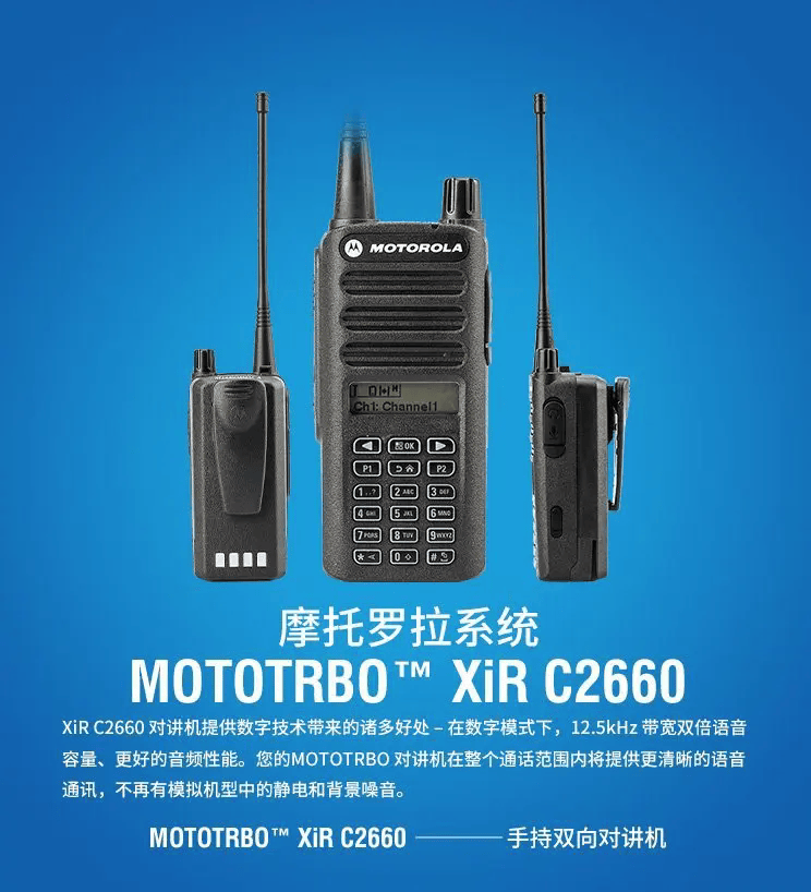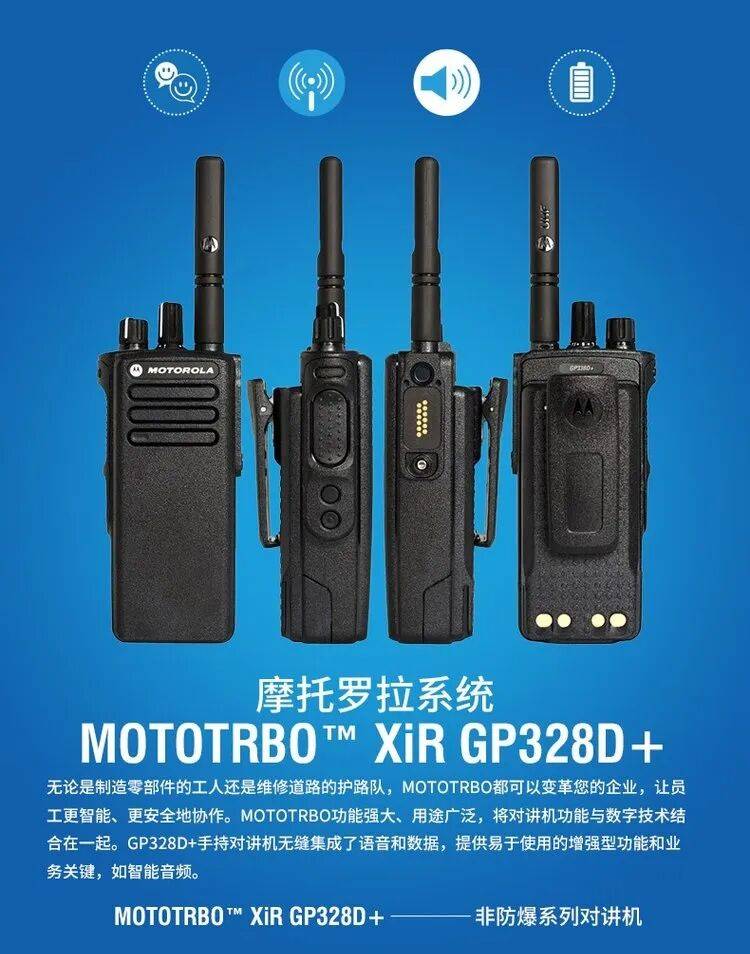 MOTOTRBO是摩托罗拉系统旗下的专业数字对讲机系列,采用ETSI标准的12.5kHz TDMA数字化技术,提供从基础语音到高级数据功能的完整解决方案,广泛应用于工业、交通、公共安全等领域。截止到2025年底,摩托罗拉MOTOTRBO对讲机在产型号有R7Ex FKP防爆、R7Ex NKP防爆、P8668Ex防爆、P8608Ex防爆、P8668i防爆、GP338D+防爆、GP328D+防爆、P6620i防爆、P6600i防爆、R7FKP、R7NKP、R7a、R5LKP、R5NKP、R2、P8668i、P8660i、P8628i、P8608i、GP338D+、GP328D+、E8628i、E8608i,P6620i、P6600i、P3688T+、P3688+、P3688、SL2M、SL1M、C2660、C2620、C1200、EVX-S24、C360共用对讲机共计三十五款机器,涵盖常规、防爆和共用对讲机三个大类。