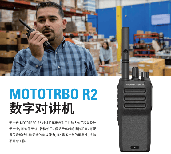 您的工作利器——MOTOTRBO R2坚固耐用,线条流畅,让您的工作游刃有余。大范围的通讯距离、可配置的音频和系统功能的集成,R2将成为您可靠的工作伙伴。MOTOTRBO R2可靠耐用、纤薄轻巧,即使在极具挑战性的工作环境中也可以提供全天可靠性。通过SINC+消噪技术、远程通信和可选择的音频配置,MOTOTRBO R2在嘈杂的工作环境中脱颖而出,使您能够清晰地进行沟通。