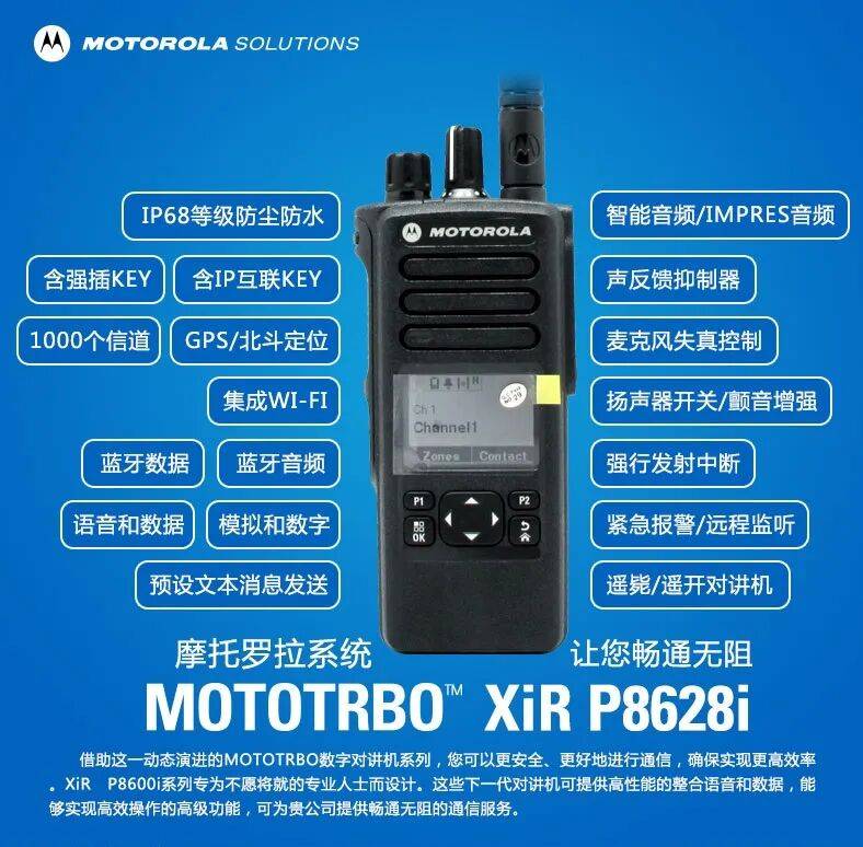 MOTOTRBO XiR P8628i是DMR标准数字对讲机,可提供关键运营语音和通信支持。支持蓝牙音频无线通话,集成Wi-Fi支持远程软件更新,同时室内和室外定位能力可确保一切资源尽在掌控之中。借助对集群技术和传统模拟技术的支持,可确保企业在不断发展的同时保持出色的通信能力。