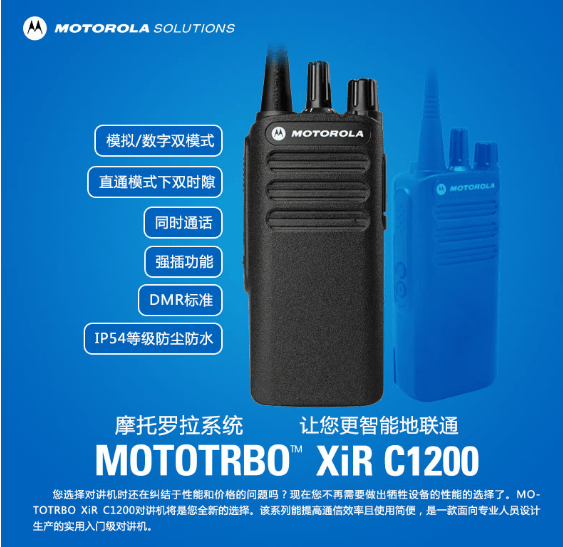 MOTOTRBO XiR C1200对讲机将是您全新的选择。该系列能提高通信效率且使用简便,是一款面向专业人员设计生产的实用入门级对讲机。