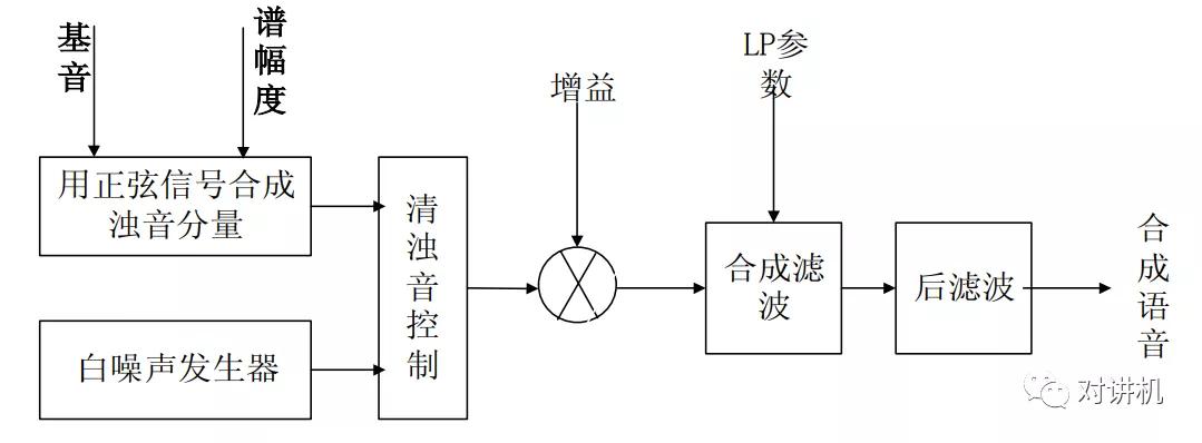 将两种经过增益调制后的信号分别通过由清浊度信息调制的带通滤波器相加,即得到合成激励信号。合成激励信号激励合成滤波器即得到合成语音。