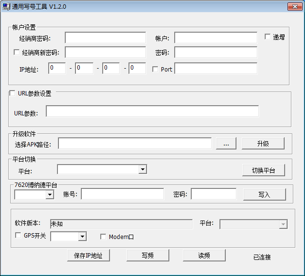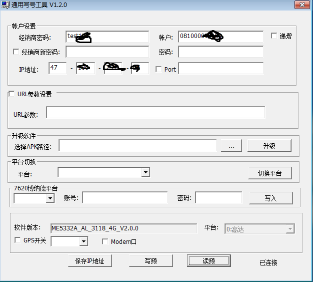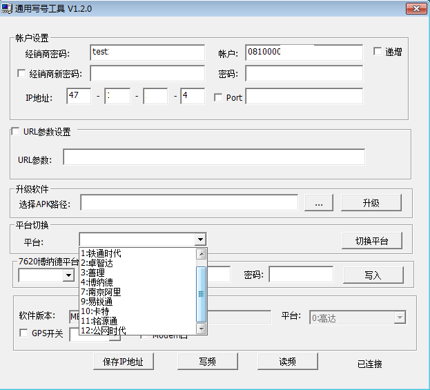 ④这样公网对讲机的信息已经完成读取,更改账户信息→设置密码→设置IP地址即可。在该软件版本中可以选择平台切换的功能,取决于您的对讲机设备是否支持该功能。