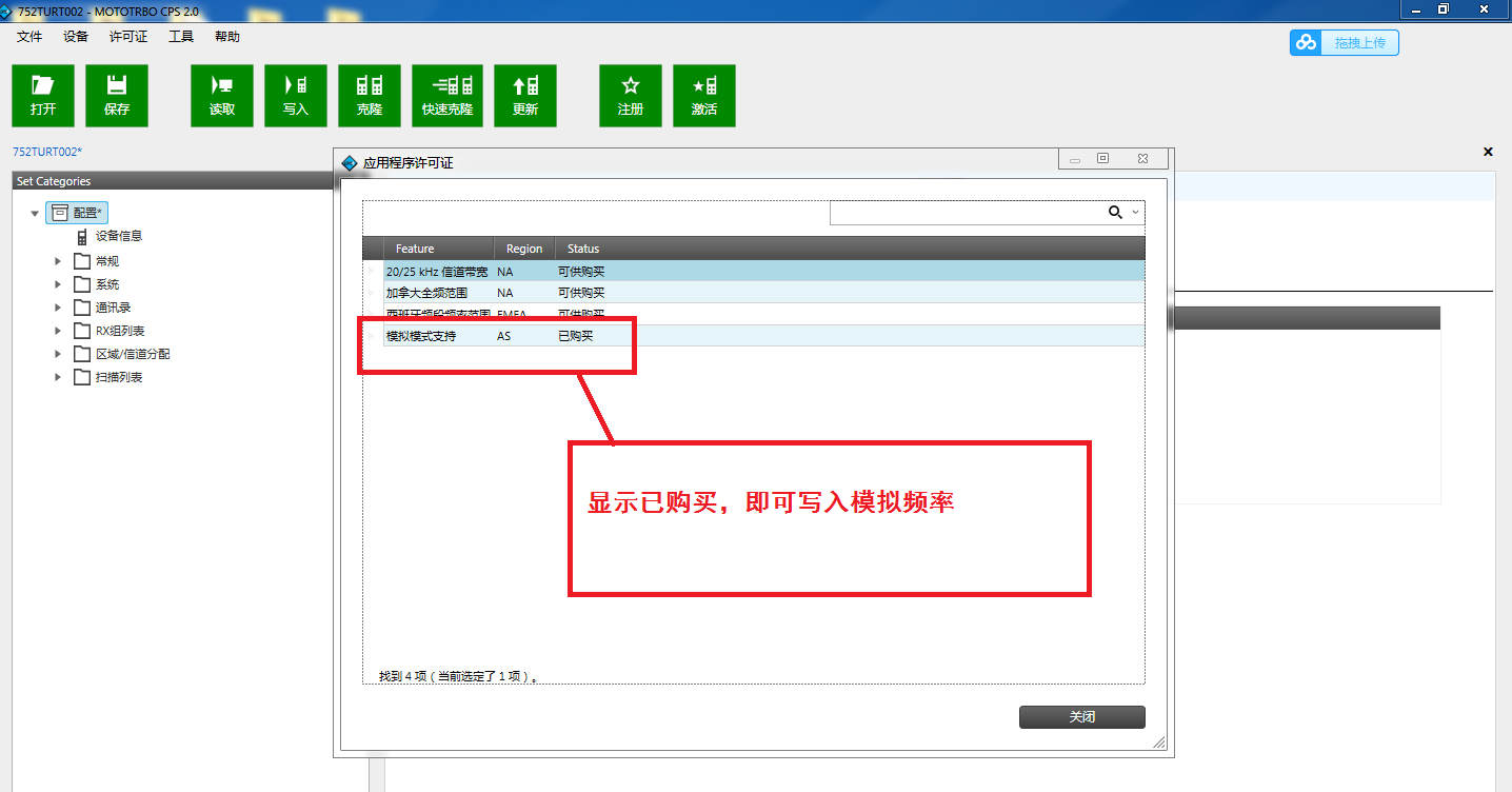 ⑤如果显示“模拟模式支持 AS 已购买”,则表示可以写入模拟频率